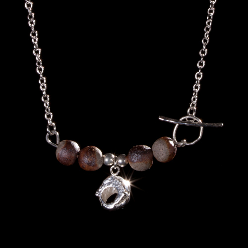 Handmade ceramic beads on silver carrier with silver beads and silver shell detail necklace suspended on a silver chain with handmade silver toggle fastening at front